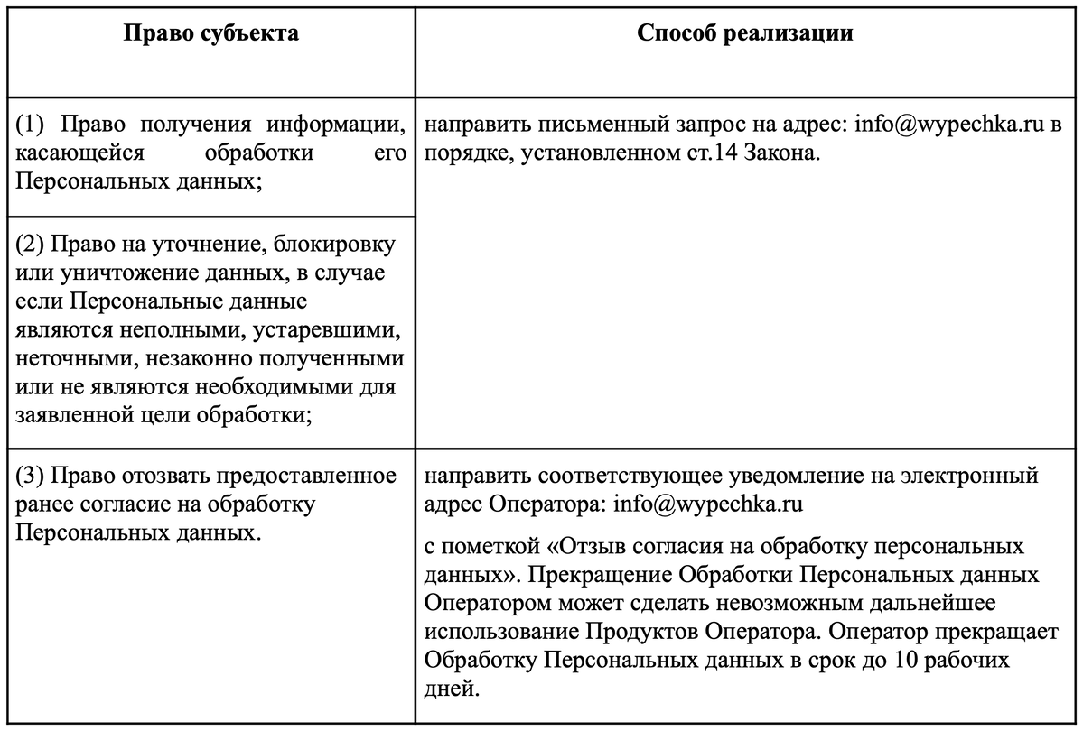 8.1. Пользователь может получить любые разъяснения по интересующим вопросам, касающимся обработки его персональных данных, обратившись к Оператору с помощью электронной почты info@wypechka.ru.