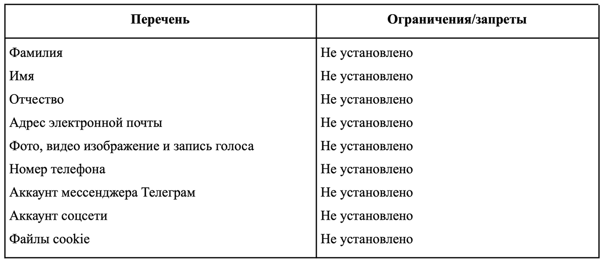 3.3.3. Перечень ПД и наличие/отсутствие ограничений или запретов в их отношении: